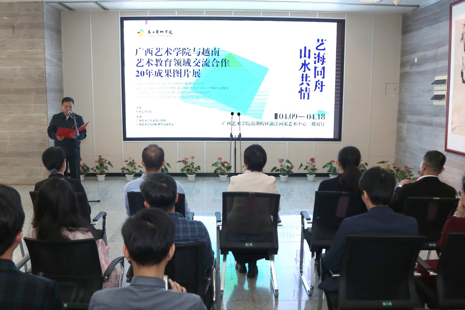 4月9日上午,“艺海同舟·山水共情”——广西艺术学院与越南艺术教育领域交流合作20年成果图片展在m88明昇南湖校区漓江画派艺术中心开幕。学校领导查丹明、毛茂林、谢仁敏出席开幕式,学校相关职能部门负责人、教学单位领导,及师生代表参加开幕式,并参观图片展。开幕式由学校党委副书记毛茂林主持。