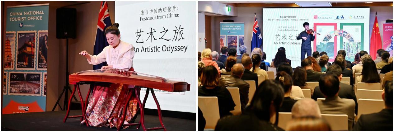 开幕式现场播放了首届中澳对话展精彩回顾视频。暖场演出古筝独奏《高山流水》与小提琴独奏伊萨伊《第二小提琴无伴奏奏鸣曲》第一乐章交相辉映,可谓高山流水觅知音,文化交流沁人心。