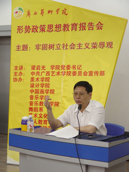 根据上级文件精神和学院统一部署,5月9日上午,梁启光书记在学院学术报告厅为社科基础部、艺术文化系师生作了一场关于“牢固树立社会主义荣辱观”的专题报告。围绕主题,梁启光书记深刻阐述了三大问题:一、社会主义荣辱观的科学涵义;二、社会主义荣辱观的现实意义;三、牢固树立社会主义荣辱观的途径。其中,社会主义荣辱观的科学涵义是梁启光书记报告深刻阐述的重点。在报告会上,结合艺文系当前实际,梁启光书记特别指出,作为新专业方向,艺术文化系是学院评估的重头戏之一,学习社会主义荣辱观对艺文系的顺利发展将起重大的推动作用。